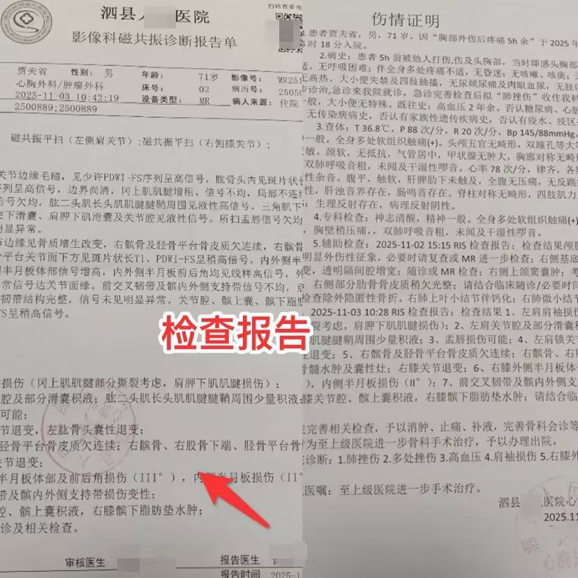 2025年11月2日上午,安徽宿州泗县草沟镇71岁老人贾夫省像往常一样,骑着三轮车前往自家农田劳作。不料,一场突如其来的冲突,让他承受了前所未有的身体与精神的双重创伤。据贾夫省描述,抵达农田后,他看到邵某峰及其儿子邵某杰、妻子李某伶和亲戚李某陈四人在相邻地块劳作。干活间隙,他提及若有人用机械抽水再占用他家田地,决不答应。这番话引发了对方的不满。邵某峰和邵某杰径直上前将他推倒在地,邵某峰将他压制住,邵某杰踩住他的肩膀,李某伶与亲戚李某也随即上前,现场陷入混乱。年事已高的贾夫省表示,虽无法完整还原每个细节,但当时多人近身接触带来的身体疼痛与恐慌,让他印象深刻。贾夫省说他被打后精神恍惚,缓解多时才起身,发现邵某杰不在了,其余3人还在地里继续干活。他缓慢地把简单的尾活弄完。他心里很乱,担心此事被儿女知道了会引发两家发生更大冲突,给家人惹祸,打算隐瞒。当日11时前,贾夫省骑三轮车返回家中。老伴发现他的异常,追问之下他才说被人打了。老伴听了之后又把事情经过告诉几个子女,到11时22分方由其子拨打了报警电话。丁湖镇派出所工作人员郑某负责处理此案。经派出所同意后,贾夫省前往泗县人民医院检查,后续的磁共振诊断报告单明确显示,贾夫省存在左肩肩袖损伤、左肩关节腔及部分滑囊积液、盂唇损伤可能等多项问题。